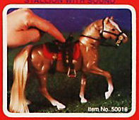 Riders were a part of the Grand Champion world from the very beginning. Even the very first set of horses were released in riding sets! Here's one of the first - and English Rider and her Silky White Stallion. She's a much simpler doll then the later versions, her clothes are simply molded plastic. However, the accessories are neat - there's even a bouquet of roses!